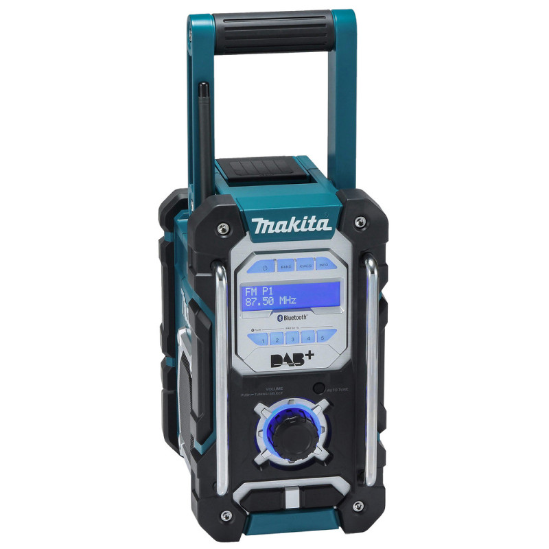 Wysoko wydajne radio z funkcją Bluetooth z klasyfikacją izolacji obudowy IP64. Zasilane akumulatorami: CXT® 7,2V; 10,8V; 14,4V i LXT® 18V oraz sieciowo. Funkcja Bluetooth umożliwia połączenie z odtwarzaczem muzyki. Wyposażony w łącze AUX i USB do ładowania telefonu.