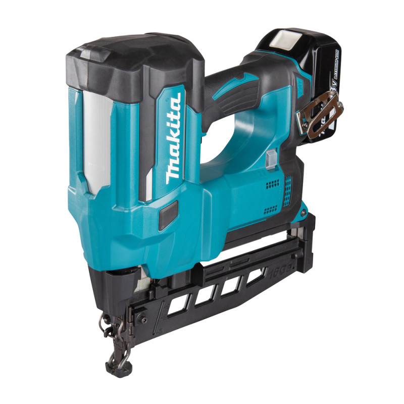 Bezprzewodowa gwoździarka akumulatorowa. Wbudowana sprężarka zapewnia wbijanie gwoździ podobne do tego, jakie oferuje gwoździarka pneumatyczna. Idealna do prac wykończeniowych takich jak na przykład montaż paneli. Gwoździarka jest kompatybilna z gwoździami (szpilkami) o średnicy 1,6 mm i długości od 25 - 64 mm.