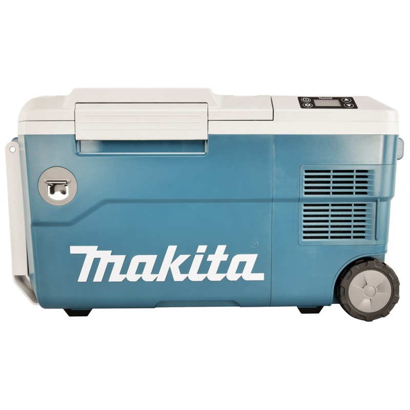 Chłodziarko-ogrzewacz CW001G utrzyma ciepło potraw do 8,5 godzin lub będzie chłodzić napoje do 28 godzin, dzięki dwóm akumulatorom 5,0 Ah XGT®. Może być podłączony do gniazda zapalniczki samochodowej, jako źródło zasilania.