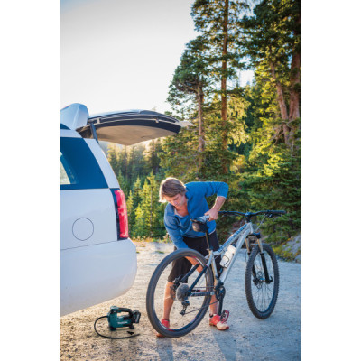 Kompresor MP001G 40Vmax XGT® z funkcją automatycznego wyłączenia urządzenia po osiągnięciu ciśnienia docelowego. Zestaw zawiera różne rodzaje końcówek do pompowania np. opon, czy piłek itp. z możliwością przechowywania ich w obudowie urządzenia.